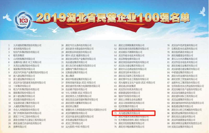 【喜報】天馬建設(shè)集團蟬聯(lián)2019湖北民營企業(yè)百強 排名上升4位