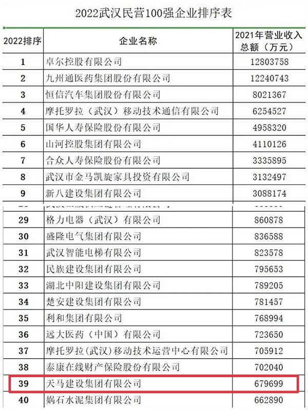 8月19日,武漢發(fā)布“2022武漢民營企業(yè)100強”和“2022武漢民營制造業(yè)企業(yè)50強”排序榜。天馬建設集團位列民營企業(yè)第39名,排名較之前上升6位。