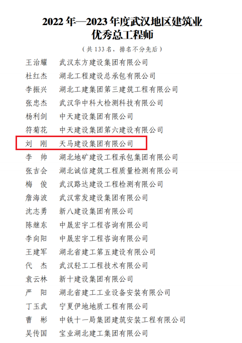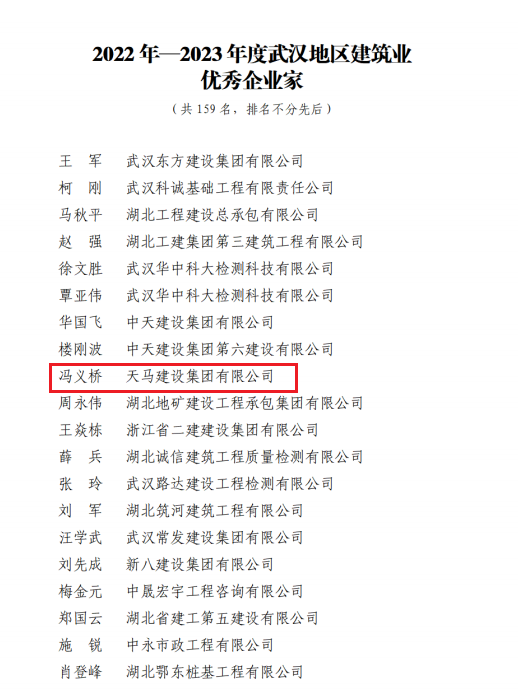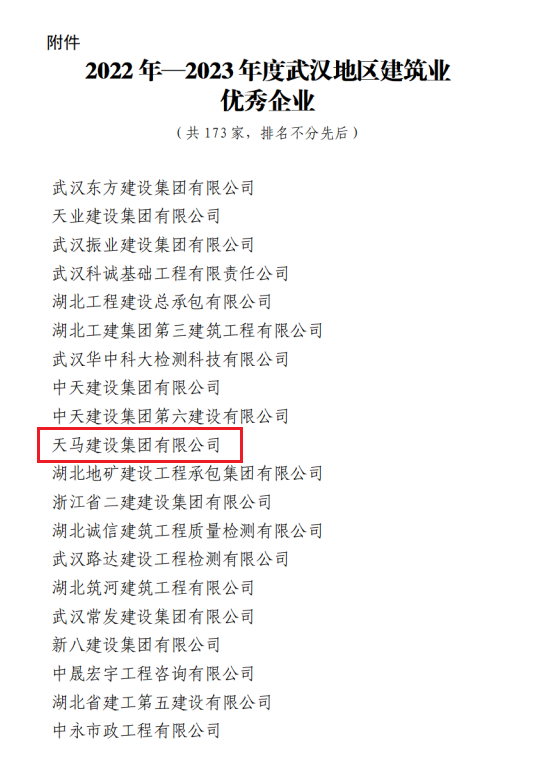 近日,天馬建設(shè)集團(tuán)榮獲2023年度武漢市最具成長性企業(yè)和2022-2023年度武漢地區(qū)建筑業(yè)優(yōu)秀企業(yè),集團(tuán)黨委書記、董事長馮義橋獲“優(yōu)秀企業(yè)家”,集團(tuán)總工程師劉剛獲“優(yōu)秀總工程師”,余勝武獲“優(yōu)秀項目經(jīng)理”。